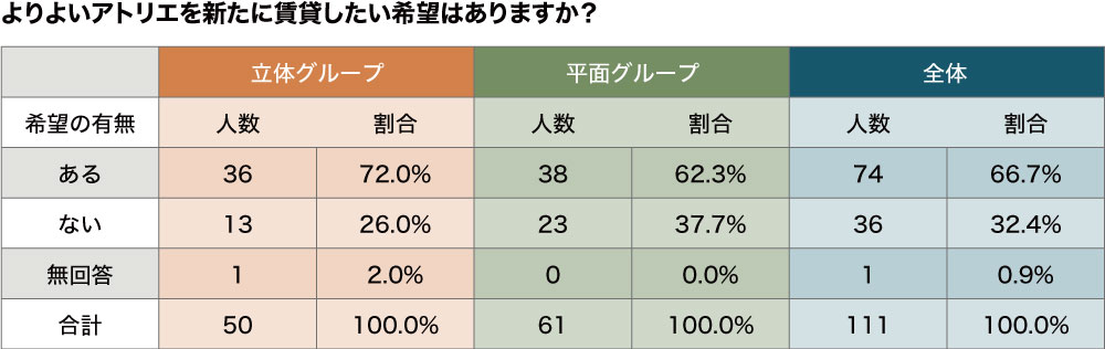 こちらは前編の最後にご紹介した調査結果で、立体グループの72.0%、平面グループの62.3%の方がよりよいアトリエを新たに賃貸したい希望があることをお伝えしました。