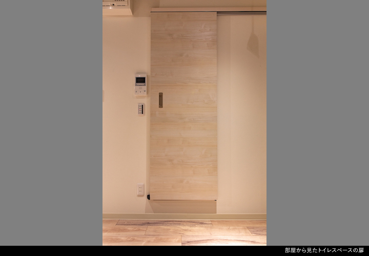 キッチンをロールスクリーンなどで隠す方法もありますが、この小商い賃貸マンションではキッチンスペースを建具で仕切って小さな空間にし、完全に見えなくしてあります。
