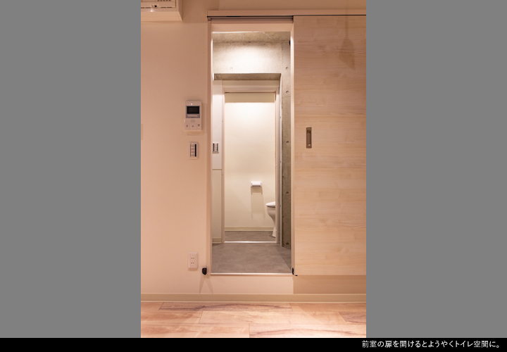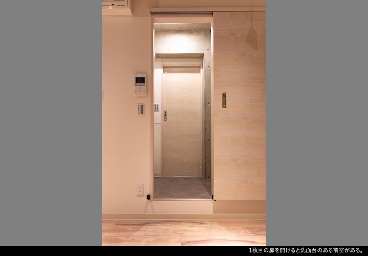 南青山の小商い賃貸マンションでは、音漏れの防御のために、トイレの前にもうひとつ別の空間をつくるという工夫を施してあります。