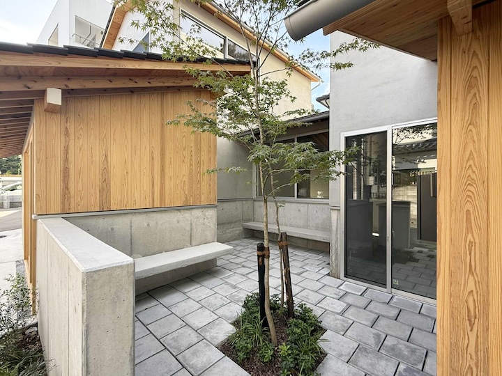 店舗入り口。こちら側も入口前にスペースがあり、ゆったりとつくられている。天気が良ければ左側のベンチ状のスペースに腰かけて寛ぐことも(写真提供/アラウンドアーキテクチャー)