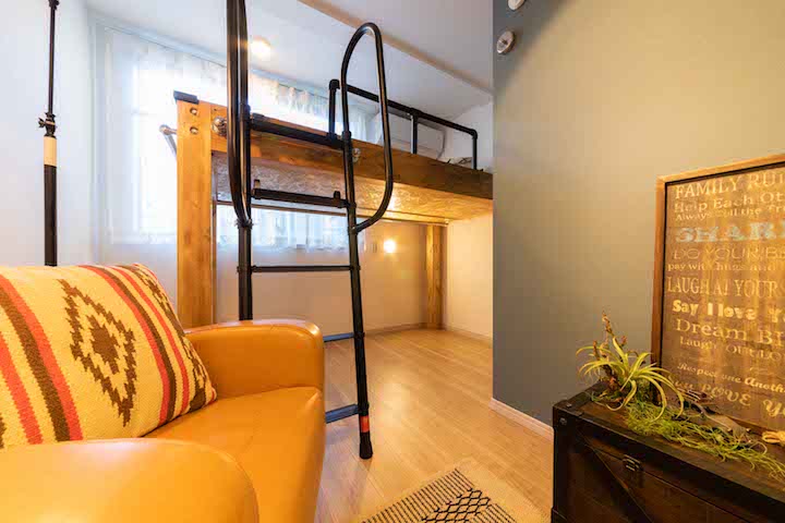 2階は長靴状のかたちになっていて、キッチンを通って洋室に入ります。洋室の奥にはロフトベッドが備え付けられていて、ロフトの上段はベッドスペース、下段はワークスペースもしくは収納スペースとして利用できます。