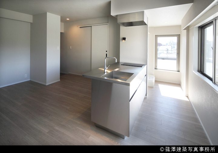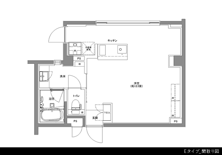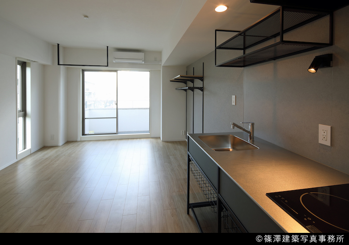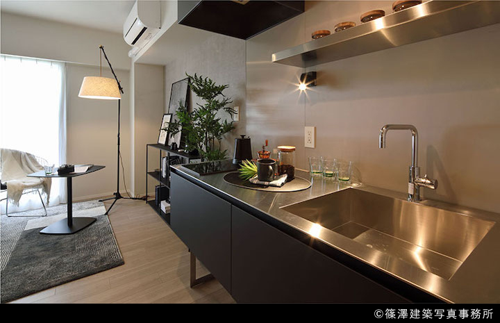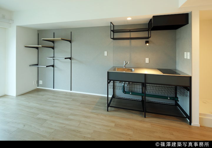 Eタイプは最上階に1室だけあるお部屋。ルーフバルコニーにつながる明るい対面キッチンを中心とした開放的なタイプで、ステンレス製のキッチンとグレーのアクセントクロスがスタイリッシュなスタジオタイプの居室です。