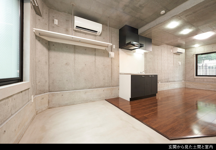 玄関から入ると4.6畳大の土間になっていて、9.4畳大の部屋が土間とひとつづきになっています。