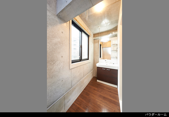 パウダールームは窓を開けると洗濯物を干せるインナーバルコニーに早変わり。洗濯機置き場もパウダールーム内にあります。